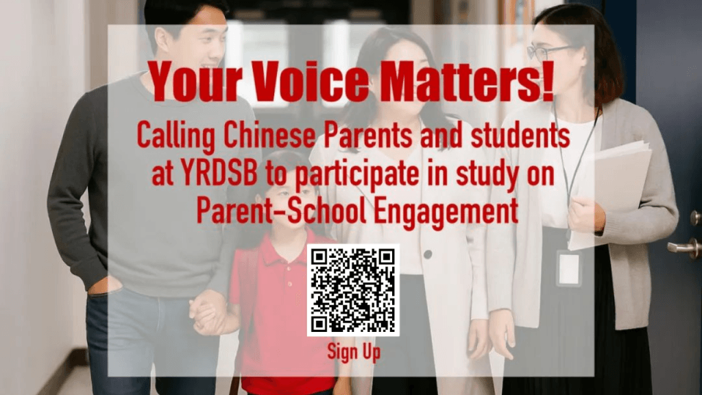 无论是遇到过挑战还是支持,您的声音都对我们非常重要!CPAC研究院正在进行一项重要的研究,旨在了解华裔家长与约克教育局(York Region District School Board)的公立学校互动的经历,以帮助华人家长与学校更有效地沟通,进而帮助学生更好地学习和成长。我们诚挚邀请华裔家长和学生参与!