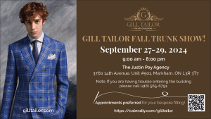 Gill Tailor is back in Toronto! Get ready for Fall and Winter with a custom-made wool jacket or cashmere overcoat made with designer fabrics! Gill Tailor made blazers are perfect for…